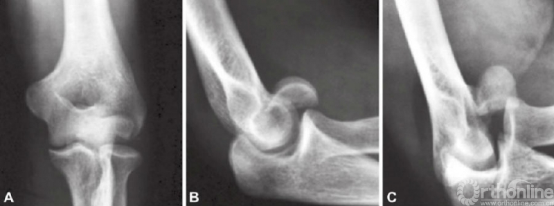 图7 A~C肱桡位片正位片上看似乎是单纯的肱骨小头骨折,事实上在侧位片和肱桡位片上可以看到合并有冠状突骨折