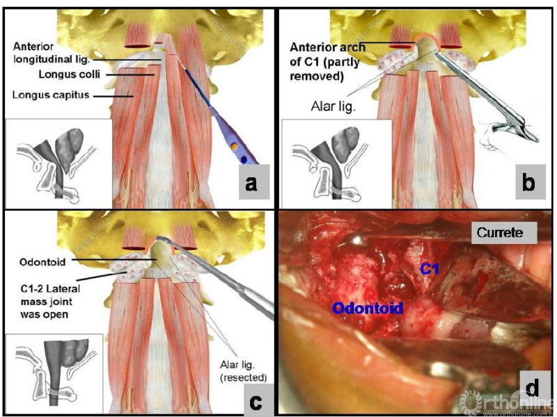 图2:经口松解术:第一步松解前方的韧带和肌肉结构;第二步松解寰枢椎侧块关节的粘连和齿突侧方的翼状韧带;第三步松解齿突尖韧带,向下轻轻牵拉齿突、齿突尖可以被拉出。说明松解完成、达到复位。