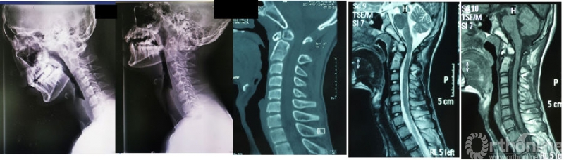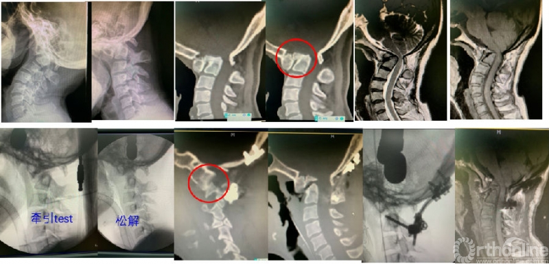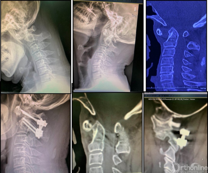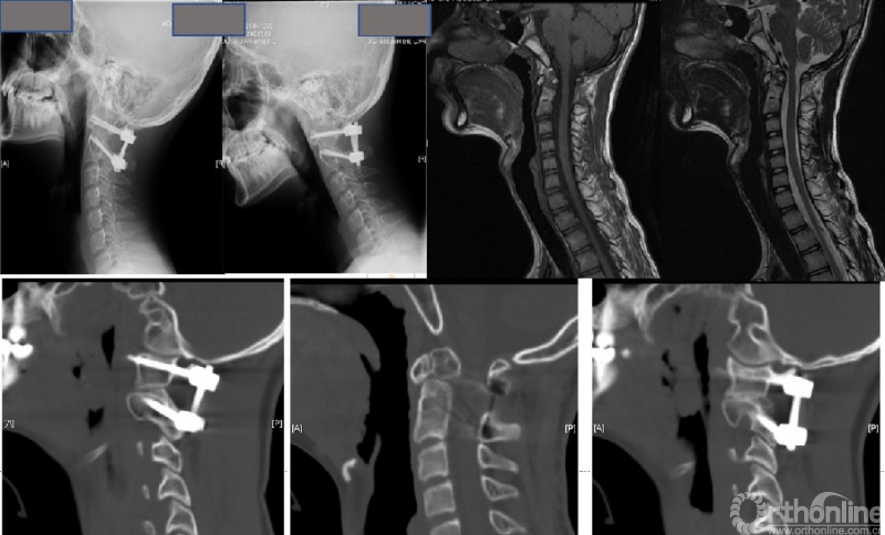 图3:女性56岁;寰枢椎脱位合并寰椎枕骨化畸形、脊髓病。经过动力位X片及术中麻醉后牵引试验,诊断为“难复性寰枢椎脱位”(Type III)。行经口寰枢松解+后路C2椎弓根固定、枕颈固定融合术。寰枢椎脱位获得解剖复位、脊髓压迫解除。