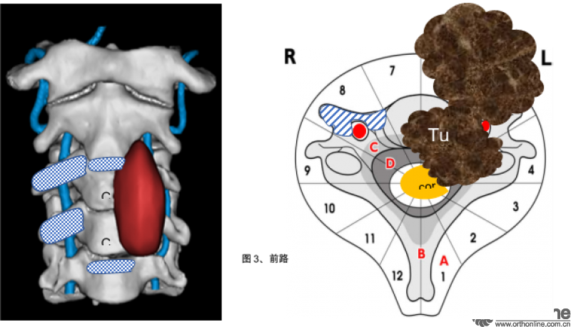 首先从前方入路,切除C2-3和C4-5椎间盘及后纵韧带,切除C3和C4右侧横突孔,游离右侧的椎动脉,切断左侧椎旁肿瘤近端和远端的颈长肌,游离椎旁软组织的肿瘤。