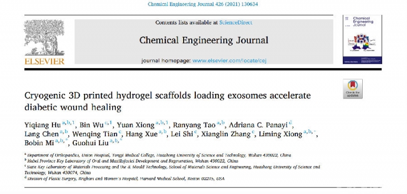 2021年6月6日,华中科技大学同济医学院附属协和医院(下称:武汉协和医院)骨科刘国辉教授团队在国际一流期刊《Chemical Engineering Journal》(IF:10.652,即时影响因子:12.891)发表了题为“Cryogenic 3D printed hydrogel scaffolds loading exosomes accelerate diabetic wound healing”研究论文(文章链接:https://doi.org/10.1016/j.cej.2021.130634)。