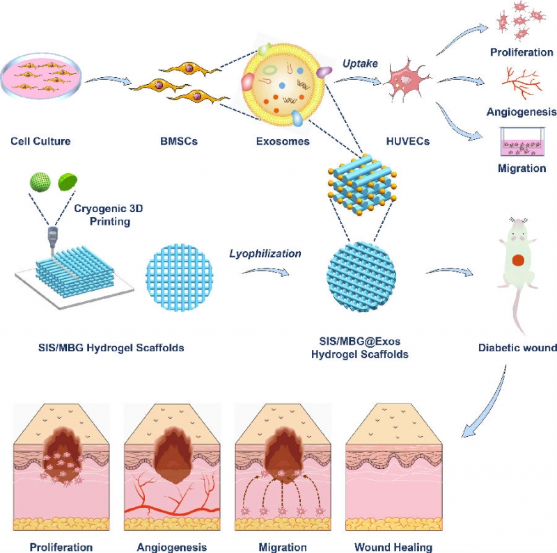 该水凝胶支架是基于3D打印技术制备了小肠粘膜下层脱细胞基质材料(SIS)和介孔生物玻璃(MBG)作为BMSCs-exos的载体,构建SIS/MBG@Exos新型复合水凝胶支架。研究结果显示,该SIS/MBG@Exos水凝胶支架具有良好的生物活性和多孔结构,为细胞的增殖和粘附提供良好的微环境,其还具有良好的止血能力,动物研究显示,该水凝胶支架能通过增强创面的血管形成和胶原形成,从而加速糖尿病创面的愈合,为糖尿病创面的治疗提供了一种新选择。