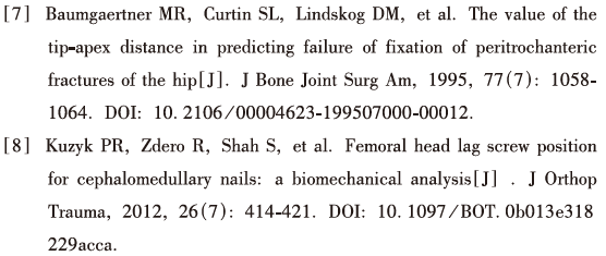 TAD是由Baumgaertner等[7]1995年描述的,这个参数在术中有助于确定头髓钉的深度和中心化程度。已经证实TAD小于25mm,一般来说即可预知治疗成功;但大多数的创伤学家将标准定为TAD小于20mm。为避免TAD过大,头髓钉的理想位置应包括两个平面,即螺钉应打到软骨下骨10mm以内,并确保在股骨头中央。2012年,Kuzyk等[8]提出了一个新的与TAD相关的指标,即股距TAD(cal-TAD),是以股骨距线与股骨头的交点与螺钉尖端连线的相对距离作为参考,而不是以股骨颈的中央线与股骨头的交点与螺钉尖端连线的相对距离。这个理论的提出,很好地解释了某些螺钉位置偏下导致TAD增大但是仍然获得很好愈合的现象。