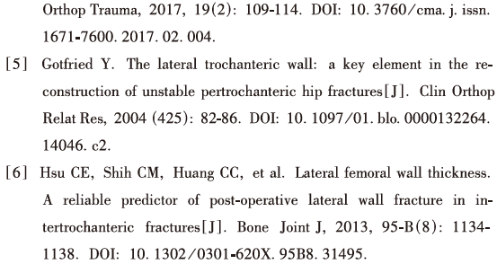 “股骨转子间外侧壁”的概念于2004年由Gotfried[5]提出,认为外侧壁对股骨转子间骨折内固定的稳定性跟后内侧一样起着关键作用。虽然对于股骨近端外侧壁的解剖划分还存在争议,但其对骨折内固定的保护作用越来越受关注。2013年,Hsu等[6]总结了大量的临床病例,发现即便术前没有骨折的外侧壁,也可能在术中发生骨折,而导致DHS固定的失效。此种情况为“菲薄的外侧壁”,而且给出了界限值20.5mm。这个理念被新版的股骨近端骨折AO分型所接受并引用。