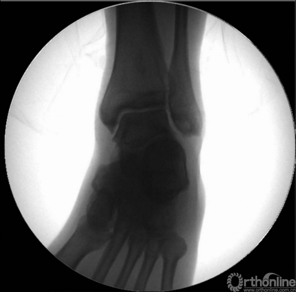 X线诊断:标准的踝关节影像学评估应包括3个位相:前后位(图5),踝穴位(内旋15°)(图6),侧位(图7)。
