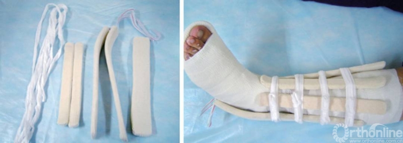 旋后—外旋型固定于内旋-内翻-背伸位,后侧以宽7.5cm的石膏绷带从膝下8cm至超足趾1cm做石膏托,胫前侧为达踝关节平面两直板,内外侧为具有内翻弧度的内翻夹板,并在下胫腓内外侧各加一大小相等的塔形垫(图14)。旋后—内收型固定于外旋-外翻-背伸位。
