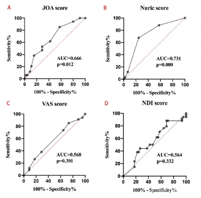 2.2 临床评分 相比霍夫曼征阴性组,霍夫曼征阳性组患者术前有较差的JOA评分和Nurick评分(P<0.05),但两组患者术前VAS评分和NDI评分比较差异均无统计学意义(表1)。ROC曲线分析结果(图1)显示,霍夫曼征可作为患者术前临床评分的预测指标,其预测术前JOA评分的灵敏度为85.29%,特异度为42.22%,AUC为0.666(95%CI 0.547~0.785,p=0.112);预测Nurick评分的灵敏度为67.65%,特异度为75.56%,AUC为0.731(95% CI 0.618~0.845,P<0.01)。