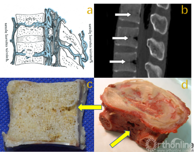 椎基静脉孔(图1)位于椎体后壁正中,两个椎弓之间,该处椎体皮质缺损,内松质骨稀疏,是椎基静脉、腰动脉分支、脊神经返支等结构进出椎体的天然孔道(图2),在椎体大体标本、磁共振和CT等影像学上均能观察到其存在。