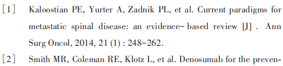 后延而导致神经根和脊髓压迫等[7,8]。因此,在临床上脊柱转移性瘤的治疗主要目的不在于治愈癌症本身,而是如何有效的降低患者疼痛,改善或维持现有功能水平,尽可能的提高患者的生活质量。