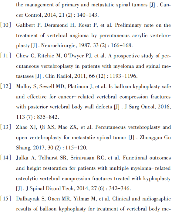 Molloy等[12]对228例癌症相关的脊椎压缩性骨折患者采用PKP治疗,发现患者术后能够有效减轻疼痛并且并未明显增加手术风险。Zhao等[13]对脊柱转移性肿瘤患者进行回顾性分析,将126例患者依据手术方式不同分为两组,转移性肿瘤进入椎管压迫脊髓、神经根的患者,43例行开放性手术治疗,83例无明显脊髓或神经根受压,或不适宜开放手术者行PVP治疗,行开放手术治疗的患者疼痛在术后1个月后明显改善,行PVP治疗的患者疼痛在术后第3天即获得明显改善,行开放手术患者中位生存时间11个月(3~36个月),行PVP患者中位生存时间16个月(12~48个月)。