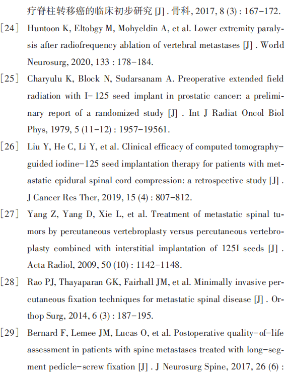 125I粒子置入技术是一项新兴的恶性肿瘤治疗技术,近年来也成为研究热门。该技术最早在 20世纪60年代应用于前列腺癌上[25],其主要工作原理是将低剂量率的单一微型放射源 125I在CT等仪器的引导下植入肿瘤体内,进而可以有效的、持续的控制肿瘤生长,与传统的放疗相比,125I粒子置入具有疗效好、创伤小、并发症少、精准且持续等优点。Liu等[26]回归性研究分析22例接受125I粒子置入技术治疗的转移瘤性硬膜外脊髓压迫症(metastatic epidural spinal cord compression,MESCC)患者,中位生存时间为10个月,3、6、12个月局部控制率分别为91.3%、81.9%和81.9%;6、12、18个月生存率分别为80%、50.0%、21.9%,结论认为125I粒子置入技术是一种安全且有效的姑息治疗方法,能够有效的缓解患者疼痛及脊髓压迫,改善患者的神经功能和生活质量。另外Yang等[27]通过对照单纯使用PVP及125I联合PVP相结合,发现125I联合PVP治疗能够取得更好的临床疗效。