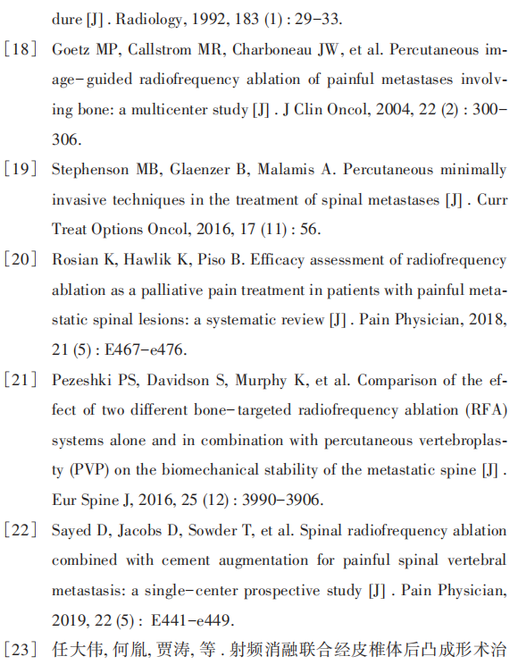 有很多研究已经证实RFA的镇痛作用,Goetz等[18]报道43例骨转移性疼痛患者中41例在6个月后接受RFA治疗后疼痛明显减轻。关于疼痛减轻的主要机制获得较多认可的是:通过破坏骨内感觉神经纤维,抑制疼痛传导,并可以抑制破骨细胞活性[19]。Rosian[20]通过总结了9项研究论文(包括4项前瞻性研究和5项回顾性研究,共583例脊柱转移性肿瘤患者接受RFA治疗),证实RFA治疗脊柱转移性肿瘤的可行性,特别是那些对传统疗法有禁忌,存在转移性椎体疼痛及有肿瘤进展危险的患者。