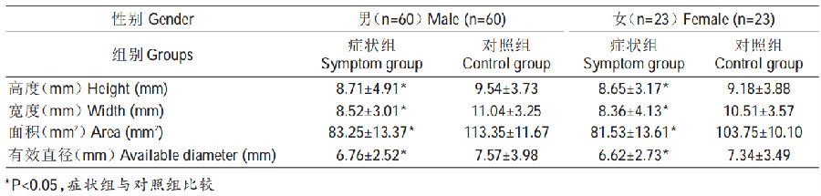 方法:观察145例腰椎间盘突出症患者的腰椎正位片,比较患侧(症状组)与健侧(对照组)椎板间隙形态,根据不同性别分别测量L4/5以及L5/S1节段双侧椎板间隙的高度、宽度和面积;通过腰椎三维CT测量腰椎板间隙的有效直径并进行统计分析。