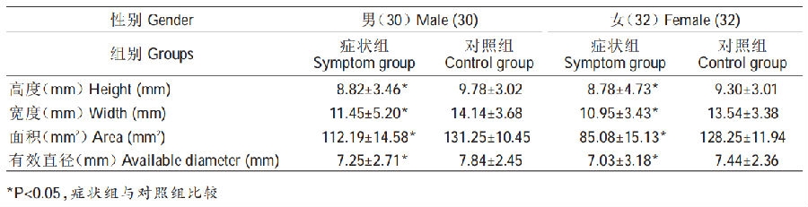 男性腰椎板间隙高度、宽度、面积以及有效直径均值大于女性,差异有显著性(P<0.05);少数女性患者的患侧椎板间隙较为狭窄,最小宽度在4mm左右。