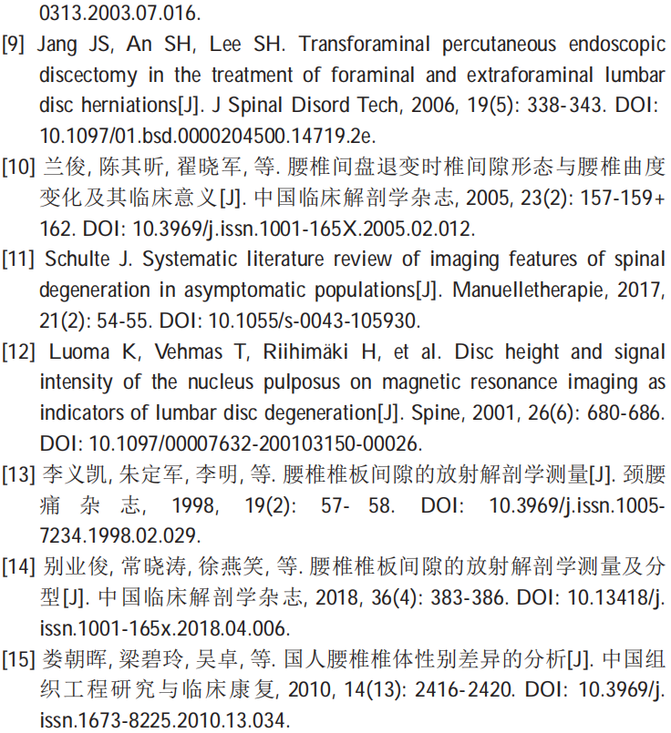 本研究存在一定的不足。首先,测量受个体差异、腰椎曲度及摄片角度等因素影响,可能存在一定的研究误差。其次,样本量较小,有待扩大样本量增强说服力。此外,腰椎间盘突出是否与先天形态发育异常的腰骶椎有关,未予深入研究。最后,笔者的研究从患侧及健侧腰椎间隙狭窄的情况出发,这种狭窄可能与腰椎间盘突出的分型以及患病时间有关,需要进一步考证。