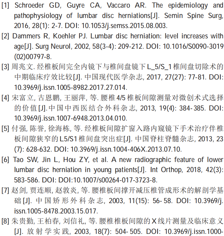 结论:腰椎间盘突出症与椎板间隙的改变存在密切联系,掌握腰椎板间隙的高度、宽度、面积以及有效直径,可指导微创手术方式的选择及术中操作。