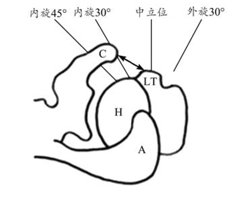 Friedman等定义喙肱间隙为轴位 MRI上上臂内旋时喙突尖和小结节间的最小距离,在最大内旋位非症状性肩关节其平均距离为11mm,而症状性的喙肱间隙为5.5mm,一般女性比男性小3mm。国内有学者测量MRI喙突与肱骨间的距离,评估其与肩胛下肌损伤程度间的关系,发现喙突撞击引起的肩胛下肌损伤与喙肱距离的减小存在相关性。Carsten等曾于不同的上臂内旋角度测量喙突尖与肱骨小结节的距离,结果显示随着内旋角度的增加,喙肱间距逐渐变小,内旋大于45 °间距有比较明显的变小,骨性接触一般发生于内旋50°~60°(图2)。