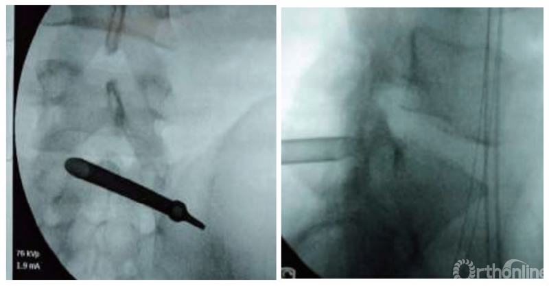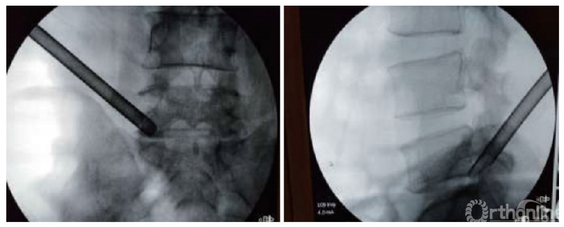 图3|B组正、侧位透视显示后方经皮椎板间入路椎间孔镜下椎间盘切除术工作套筒的位置