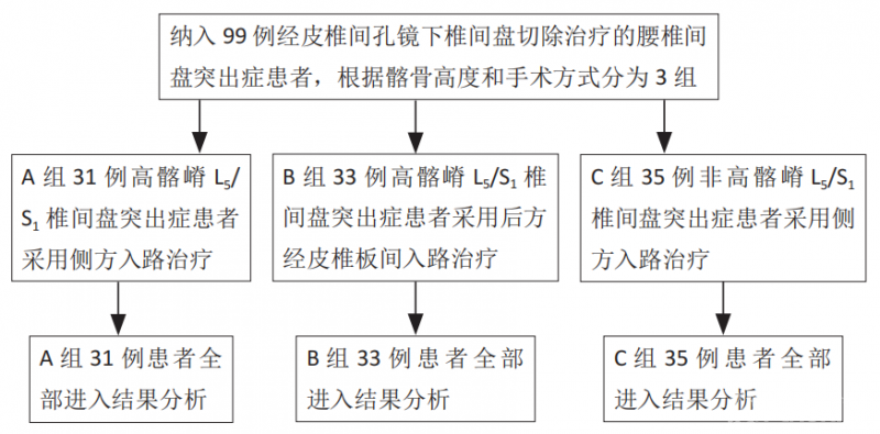 选择2015年7月至2017年4月在北京积水潭医院脊柱外科行椎间孔镜手术的腰椎间盘突出症患者,根据入选标准,最终选择99例患者作为研究对象,其中男53例,女46例;年龄14-59岁,平均32.4岁;病程2-18个月,平均5.2个月。根据手术方案及患者特点分为3组,其中A组31例为伴有高髂嵴的L5/S1椎间盘突出症患者,采用侧方入路经皮椎间孔镜下椎间盘切除治疗;B组为33例伴有高髂嵴的L5/S1椎间盘突出症患者,采用后方入路经皮椎板间椎间孔镜下椎间盘切除治疗;C组为35例非高髂嵴L5/S1椎间盘突出症患者,采用侧方入路经皮椎间孔镜下椎间盘切除治疗。