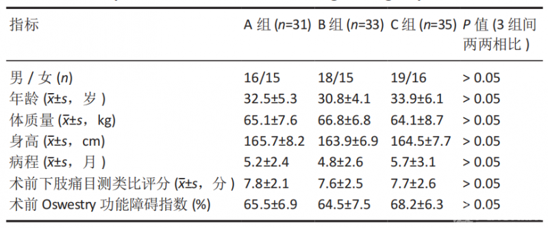 A组31例、B组33例、C组35例患者均顺利完成手术并获得随访,样本无脱落,手术前后目测类比评分、ODI及影像学资料完整,全部进入结果分析。