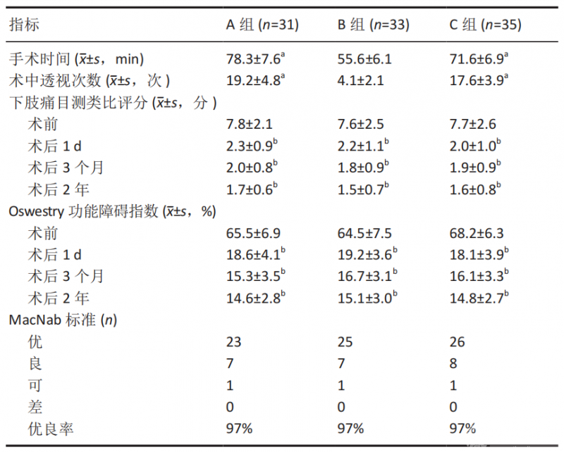 A组和C组的手术时间长于B组,差异有显著性意义(P<0.05);A组的手术时间长于C组,但是差异无显著性意义(P>0.05)。 A组和C组的透视次数多于B组,差异有显著性意义(P<0.05);A 组的透视次数多于C组,但是差异无显著性意义(P>0.05),见表2。3组患者的术后下肢痛目测类比评分和ODI均较术前显著降低(P<0.05),但是相同时点3组之间的下肢痛目测类比评分和ODI相比差异并无显著性意义(P>0.05)。按照MacNab标准术后2年随访时,A组、B组和C组的优良率分别为96.8%、97.0%和97.1%,3组相比差异无显著性意义,见表2。