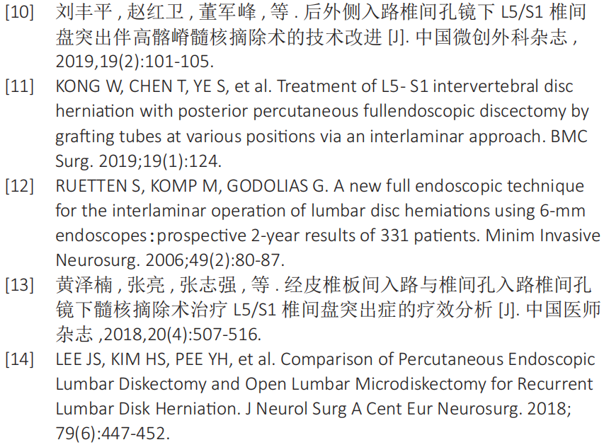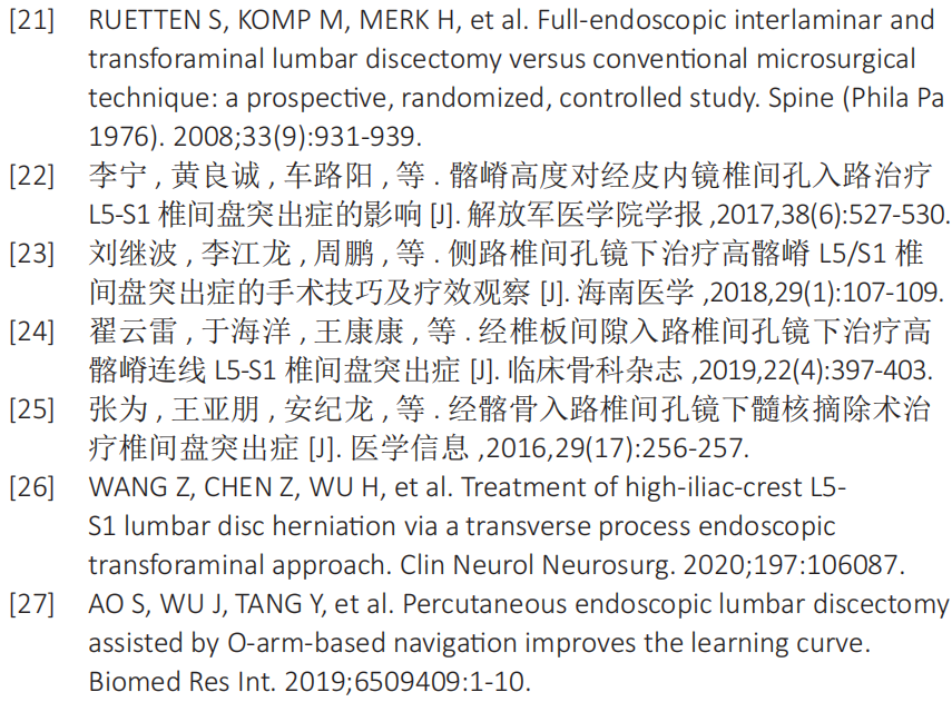 尤其在治疗伴有高髂骨的L5/S1腰椎间盘症时,手术入路受到高髂嵴以及肥大L5横突的影响,给穿刺到达腰椎间盘突出部位带来困难。一部分病例可以通过改良椎间孔成型达到髓核摘除的目的[10];另外一部分病例可以采用椎板间入路进行椎间孔镜手术[11],但是采用椎板间入路时需要经过椎管,增加了损伤神经根和硬膜囊的风险,术后出现神经粘连的程度也会增加[12]。此次研究的目的在于总结分析侧方入路和椎板间入路椎间孔镜下椎间盘切除治疗伴有高髂嵴的L5/S1椎间盘突出症的适应证和优缺点等相关临床经验。
