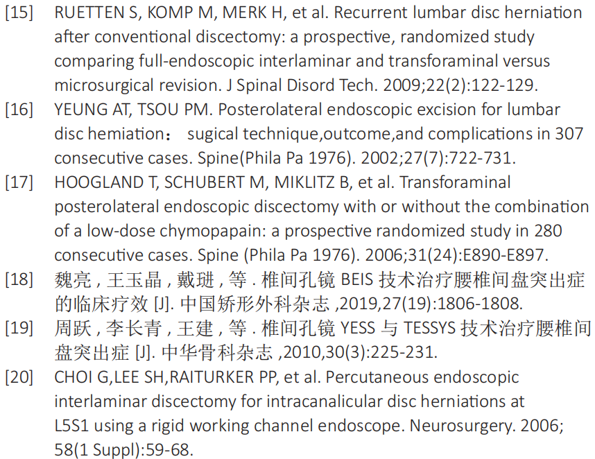 国内的临床医师将相关技术进行改进和创新,应用“靶点穿刺”技术精准将椎间孔镜通道放置到椎间盘突出的病变部位,进行精准椎间盘切除[19]。在实践中临床医师将椎间孔镜器械不断改良、手术技术不断改进,又发展出应用椎间孔镜器械进行后方经椎板间入路的椎间盘切除术,且取得满意的临床疗效,从而不断扩大应用椎间孔镜技术治疗椎间盘突出症的适应证,提高治疗腰椎间盘突出症的治疗效果[20-21]。但是后方椎板间入路手术需要从后方进入椎管,对神经刺激大,术后容易出现神经激惹症状;侧方入路在切除中央型椎间盘突出、极外侧椎间盘突出以及伴有椎间孔狭窄的病例中更有优势。