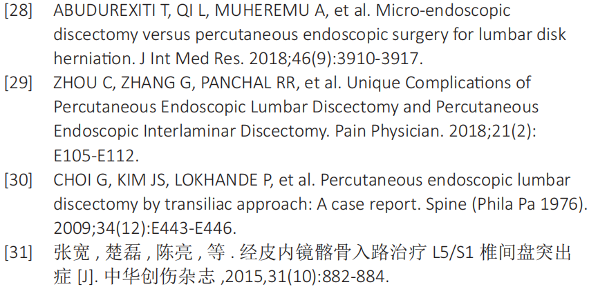 腰椎间盘切除手术是保守治疗效果不好的腰椎间盘突出症的主要治疗手段。经皮椎间孔镜手术在临床中的应用越来越广泛,和开放的椎间盘切除术相比,经皮椎间孔镜手术有更加微创、并发症少等优势[14-15]。