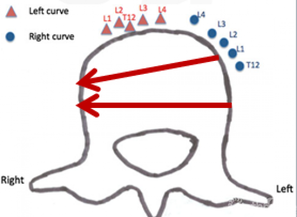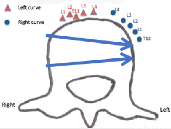 同时他们通过CT观察发现左与右侧凸的胸腰弯/腰弯AIS患者主动脉与脊椎的相对位置存在差异,由于脊椎向凸侧旋转,在左侧凸患者中,主动脉从正常时的椎体左侧旋转至椎体前方偏右的位置;而在右侧凸中,主动脉向椎体左后方旋转,这预示在右侧凸患者中,椎体置钉时主动脉损伤的风险更高。