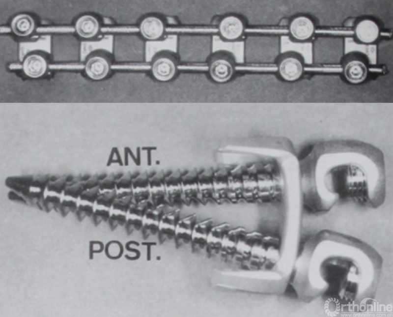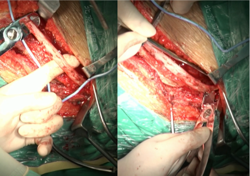使用双棒系统时先安装背侧的棒,可进行90°的去旋转,也可以直接通过前方螺钉矫正冠状面和矢状面的畸形,然后固定后方的棒,可进一步通过加压矫正冠状面畸形。