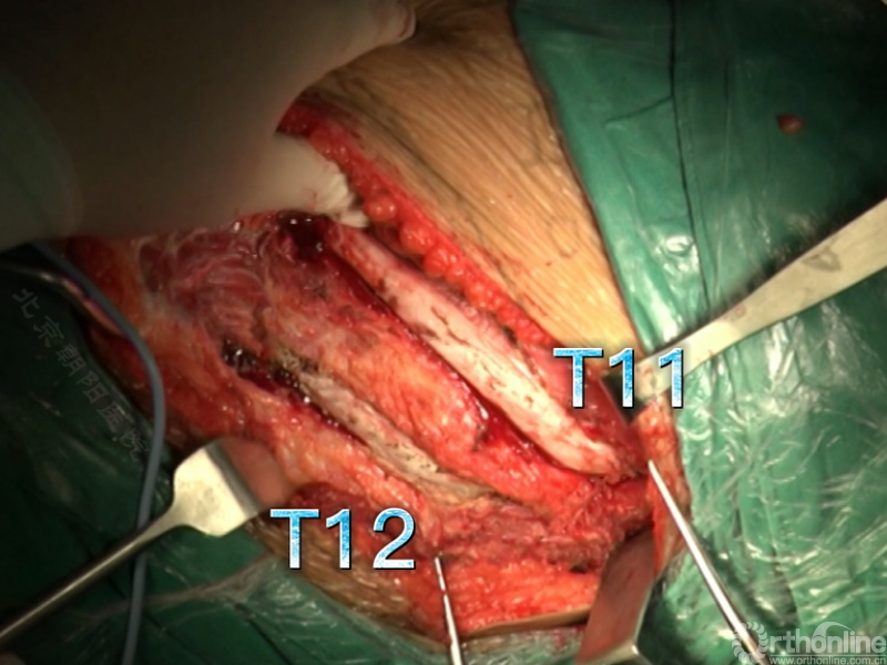 经近端需内固定的椎体(T11)相对应的肋骨表面做一弧形切口,分离浅层软组织直至肋骨表面的多层肌肉组织,切口止于脐的远端偏外侧。