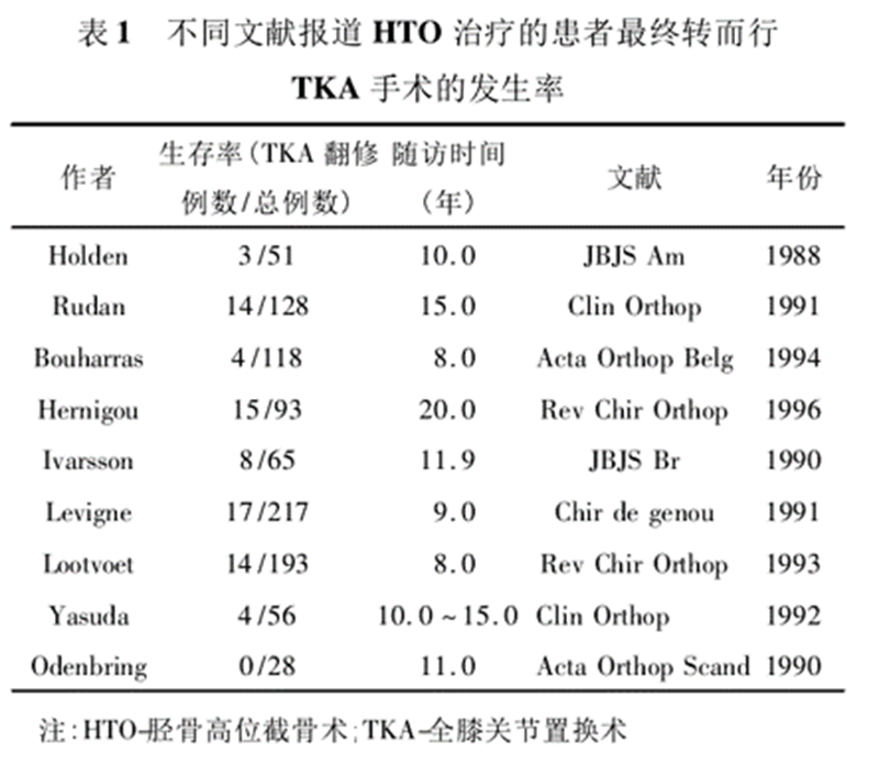 Odenbring等采用HTO治疗314例,随访时间为10-19年,其中144例力线矫正满意,170例力线矫正不足。前者只有8例接受了翻修,后者有54例接受了翻修。Odenbring认为,如果准确地实行HTO,其生存时间可与TKA的生存时间相媲美。