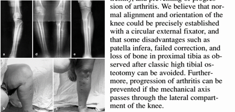 Cengiz Sen等治疗53例,取得良好疗效。相对于采用内固定术治疗,外固定支架可避免矫正度数丢失,胫骨近端骨缺失等,可以延缓关节炎进展。