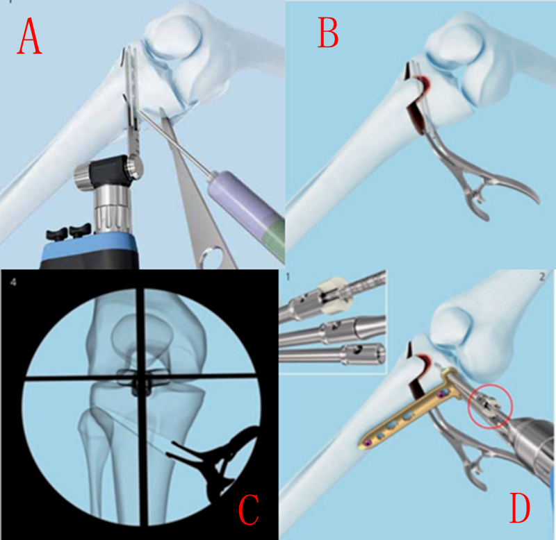 A.双平面截骨,第一刀沿水平面在胫骨后2/3进行截骨,保留外侧合页约10mm,第二刀沿冠状面在胫骨前1/3进行截骨,两刀截骨角度呈110°。B.撑开器逐渐缓慢加大骨缝,注意保留外侧合页。C.力线杆定位,撑开至力线杆经过Fujisawa点。D.进行内固定。