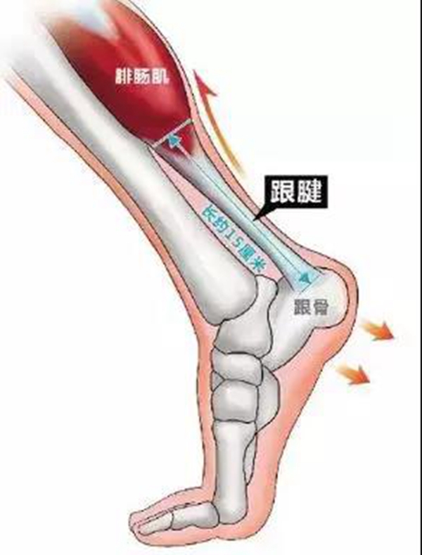 跟腱是人体最长、最强壮的肌腱,起于腓肠肌和比目鱼肌,止于跟骨结节,长约15cm。它在腱的背侧约有4-8层润滑层,位于深筋膜与腱组织之间,每层有独自的营养血管。具有踝关节跖屈,完成脚尖站立、正常走路、跑、跳、上下楼梯等动作的功能。