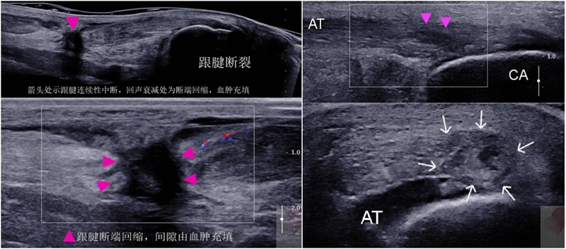 (1)完全跟腱断裂:肌腱纤维完全中断不连续,边缘呈锯齿状,由于组织水肿,肌腱断端收缩,超声学上表现肌腱回缩增粗,肌丝缺如,由于出血和渗出,裂隙中间为低回声区或无回声区。