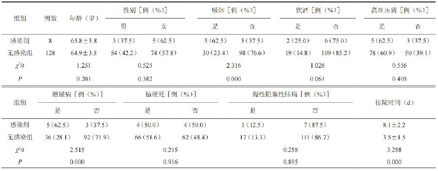 方法:选择2015年1月至2019年12月首都医科大学附属北京朝阳医院收治行脊柱骨折经皮椎体后凸成形术患者136例,根据脊柱骨折术后有无感染,分感染组8例和无感染组128例。收集患者基本信息,包括性别、年龄、吸烟和饮酒史、合并的基础疾病及感染指标情况等相关资料,进行统计学分析。