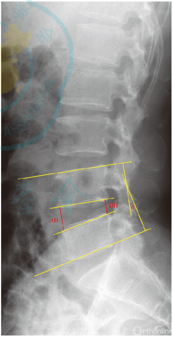 图1 椎间高度及活动度测量方法示意图。椎间高度:以腰椎侧位X线片椎体前缘高度AH与后缘高度DH的均值表示椎间隙高度;活动度:测量腰椎正侧位及过伸过屈位X线片手术节段及邻近节段Cobb角α表示腰椎活动度