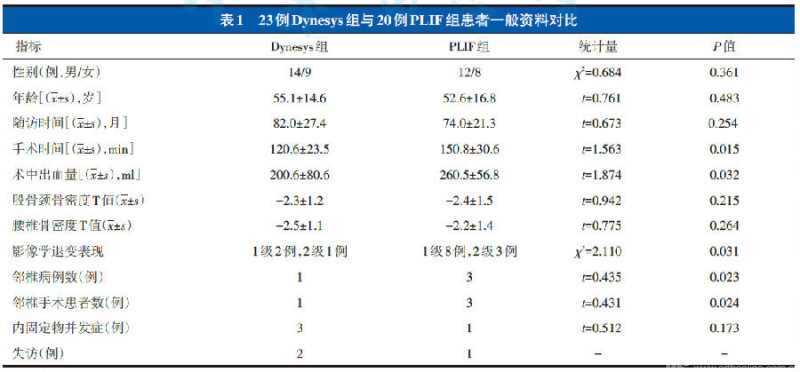 本研究回顾性分析43例双节段腰椎退行性病变患者资料,分别采用Dynesys动态稳定系统以及PLIF进行手术治疗,通过中长期随访,比较两组患者的临床疗效和影像学结果,目的在于:①探讨应用Dynesys动态稳定系统或PLIF融合术的优缺点;②分析Dynesys动态稳定系统在后期可能存在的问题,并为手术方式的选择提供一定的借鉴。