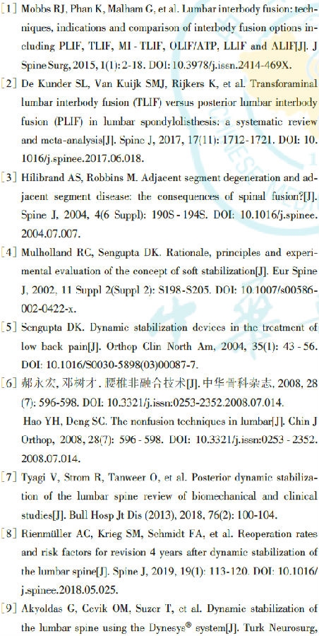 Dynesys动态稳定系统与PLIF融合术在双节段腰椎退行性疾病的诊疗中均具有显著的疗效。但较PLIF融合术,Dynesys动态稳定系统能够在长期随访中一定程度的保留腰椎活动单元的活动性,避免了腰椎邻近节段椎间盘应力过于集中并进一步加速退变可能。虽然本研究的随访时间较之前报道的文献有所增加,但对后续更长时间的研究的参考价值有限,需要进一步更长时间及增加样本量的随访研究以得出更加确切的临床研究结果。