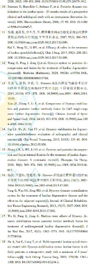 从上述各位学者的临床观察结果中可以看出,Dynesys动态稳定系统在腰椎术后早中期的功能恢复及预防术后并发症中具有一定的优势。但是国内外对于中长期的、尤其是多节段的Dynesys研究仍缺乏足够的样本量和回顾性研究经验[18-19]。