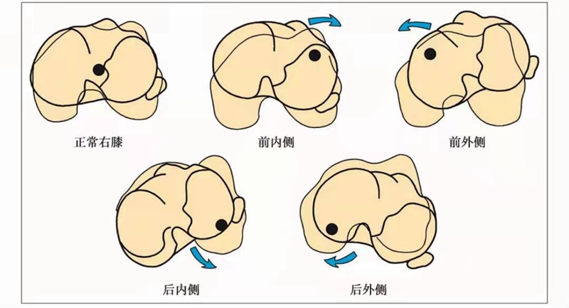 1968年Slocum提出在前十字韧带和内侧副韧带损伤时出现胫骨内髁向前半脱位,称之为前内侧旋转不稳定,此时其旋转轴(垂直轴)必然发生相应的移动(图中黑点所示),不同的韧带结构损伤将会发生不同方向的旋转不稳定,即前外侧复合不稳定,前内侧复合不稳定,后外侧复合不稳定,后内侧复合不稳定等。见图1。