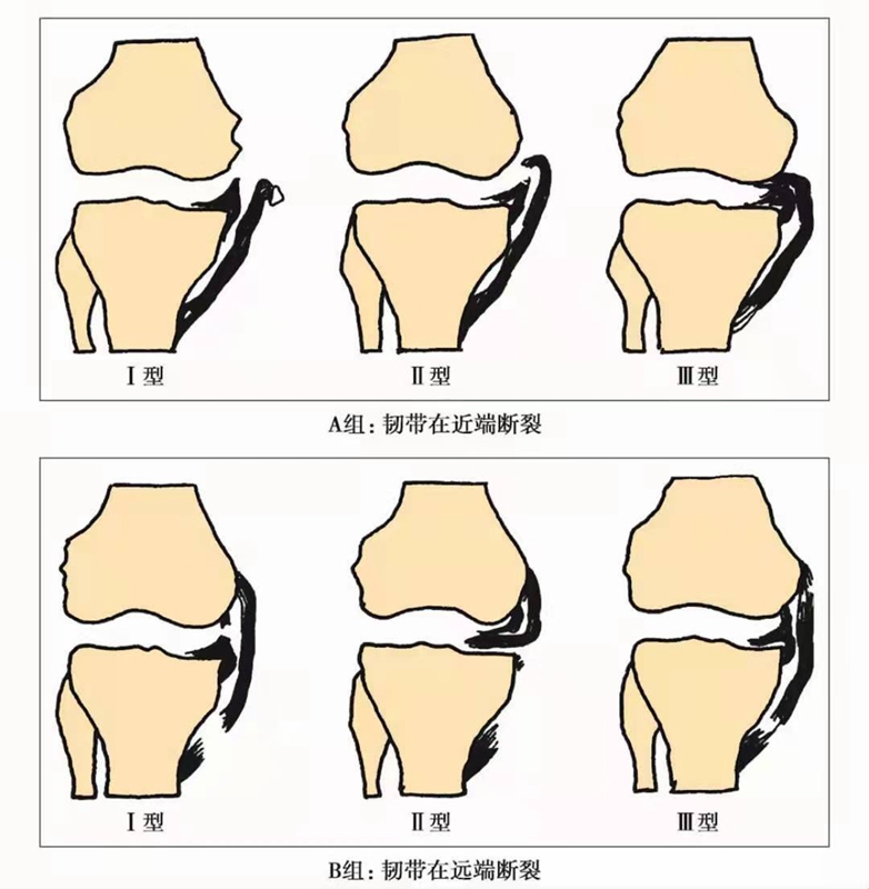 Ⅰ型:内侧副韧带在股骨髁附着点撕脱伴有骨片,内侧关节囊韧带断裂。