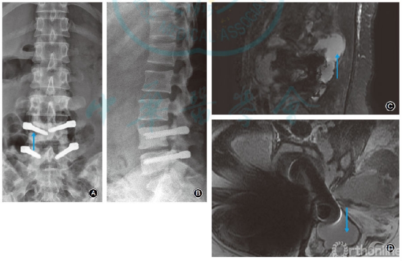 图1 女,40岁,腰痛伴左下肢疼痛4d。3年前行L4-5椎间盘髓核摘除及Dynesys动态内固定,有糖尿病病史。白细胞计数为18.88×109/L,中性粒细胞比例0.91,C反应蛋白170.00mg/L,降钙素原0.35ng/ml,红细胞沉降率120.00mm/1h。诊断为腰椎内固定术后晚期感染,予以内固定取出。A腰椎正位X线片示L4椎弓根螺钉周围骨质吸收、内固定松动(箭头所示);B腰椎侧位X线片示L4椎弓根螺钉周围骨质吸收、内固定松动,L4,5椎体骨质硬化;C腰椎MRI矢状面脂肪抑制像示椎旁积脓(箭头所示);D腰椎MRI横断面T2WI片示椎弓根螺钉及间隔器周围积脓伴双侧腰大肌脓肿(箭头所示)