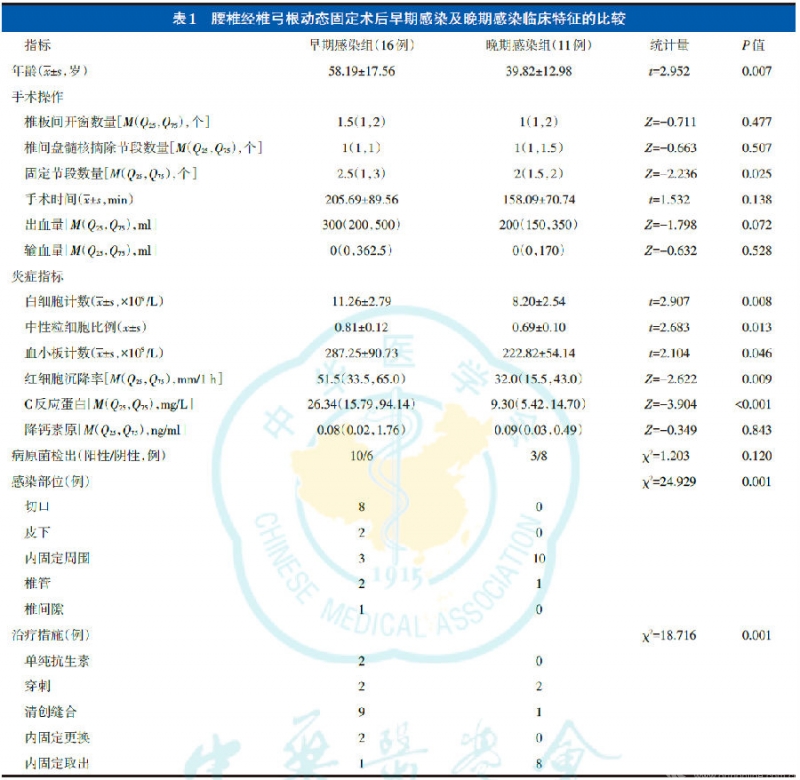 早期感染组与晚期感染组椎板开窗数量、椎间盘髓核摘除节段数量、手术时间、术中出血量、术中输血量的差异均无统计学意义(P>0.05);早期感染组的炎症指标除降钙素原外均高于晚期感染组(P<0.05);两组病原菌检出率分别为62.5%(10/16)、27.3%(3/11);早期感染组主要感染部位为切口(50.0%,8/16)和内固定周围(18.8%,3/16),晚期感染组主要为内固定周围(90.9%,10/11);早期感染组采用清创缝合9例、穿刺2例、内固定更换2例,晚期感染组采用内固定取出8例、穿刺2例。