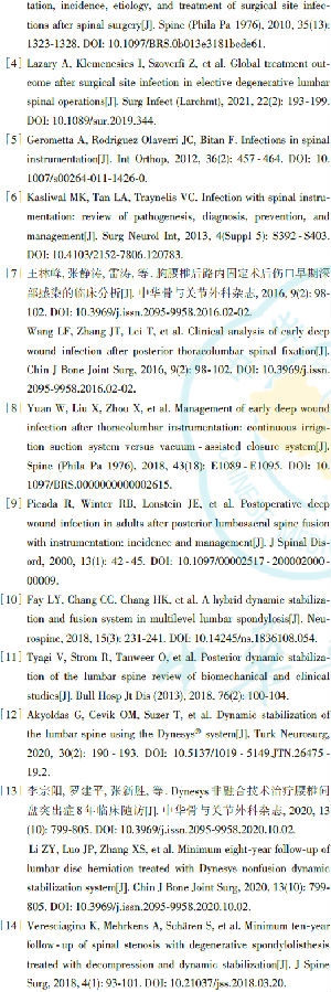 对腰椎动态固定手术,我们主张椎板间开窗,保留关节突关节的外侧1/2,通过潜行扩大侧隐窝达到神经根管的彻底减压;即使是同一节段的双侧减压,也能保留棘突及双侧椎板中上份结构。因此,采用腰椎动态固定手术的患者脊椎大部分后柱结构可以保留,对脊柱稳定性影响较小。因此,即使发生术后感染,取出内固定对脊柱的稳定性也没有太大影响。脊柱术后感染是否取出内固定,主要应根据感染部位、感染程度、钉道受累情况、全身情况、营养状态、病原菌药敏试验结果以及患者的经济承受能力、依从性等多种因素综合考虑。闫廷飞等[26]认为,腰椎内固定术后感染,对内植物是取出还是保留没有“金标准”,主要取决于患者的实际情况。