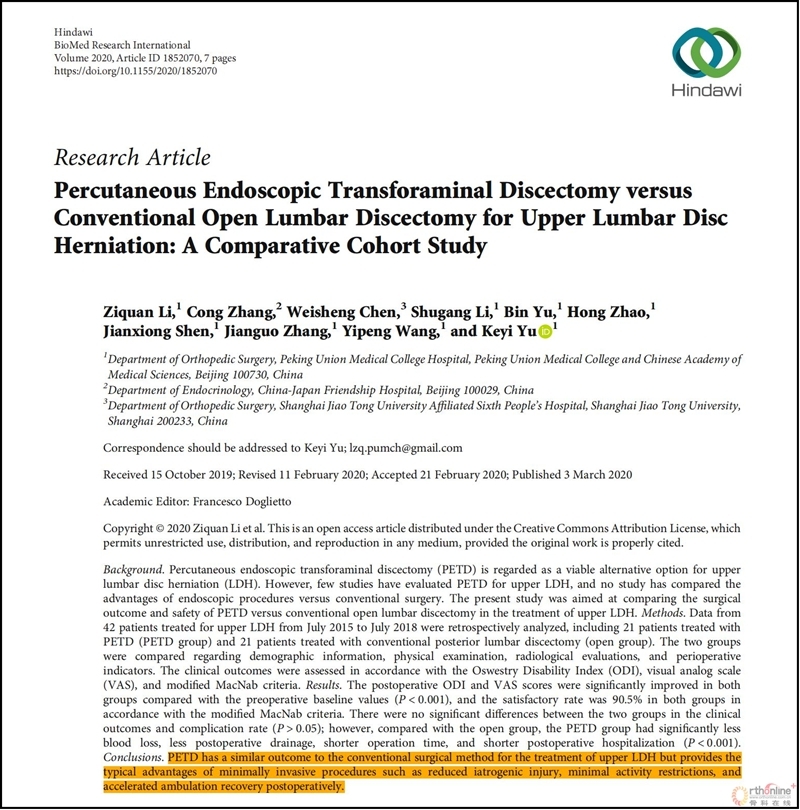研究报道,椎间孔镜治疗单纯ULDH临床证实是安全且有效的。