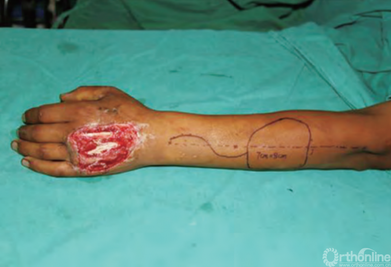 图1 手背皮肤缺损设计骨间动脉皮瓣转移修复创面