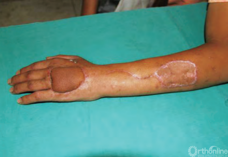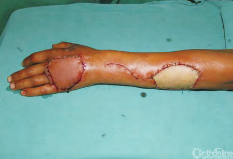 缝合打包跨供区加压法植皮加压固定可靠,术后皮片成活质地柔软,色素沉着轻,挛缩发生较少。本术式操作简便、安全,植皮成活率高,术后外形满意,是一种较为实用的方法。