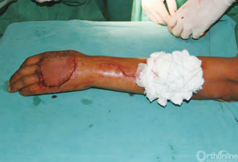 皮瓣移植术是修复四肢皮肤软组织缺损的常用治疗方法,皮瓣转移后,供区往往残留新的可以接受游离皮片移植的新鲜创面。手背、前臂和小腿部供区创面由于皮肤的松弛臃肿,部分病例可以直接缝合封闭创面,但大多数创面需要植皮覆盖。